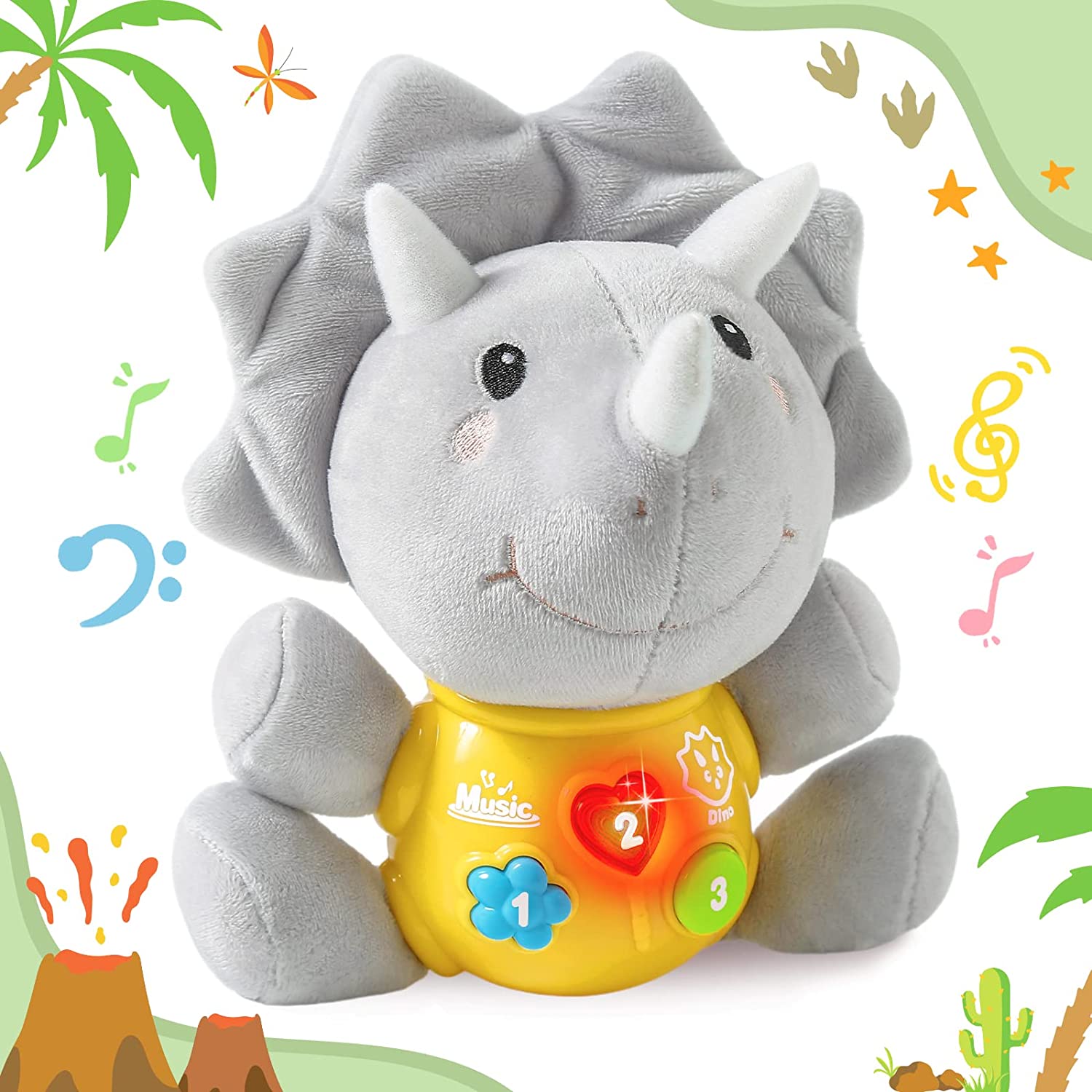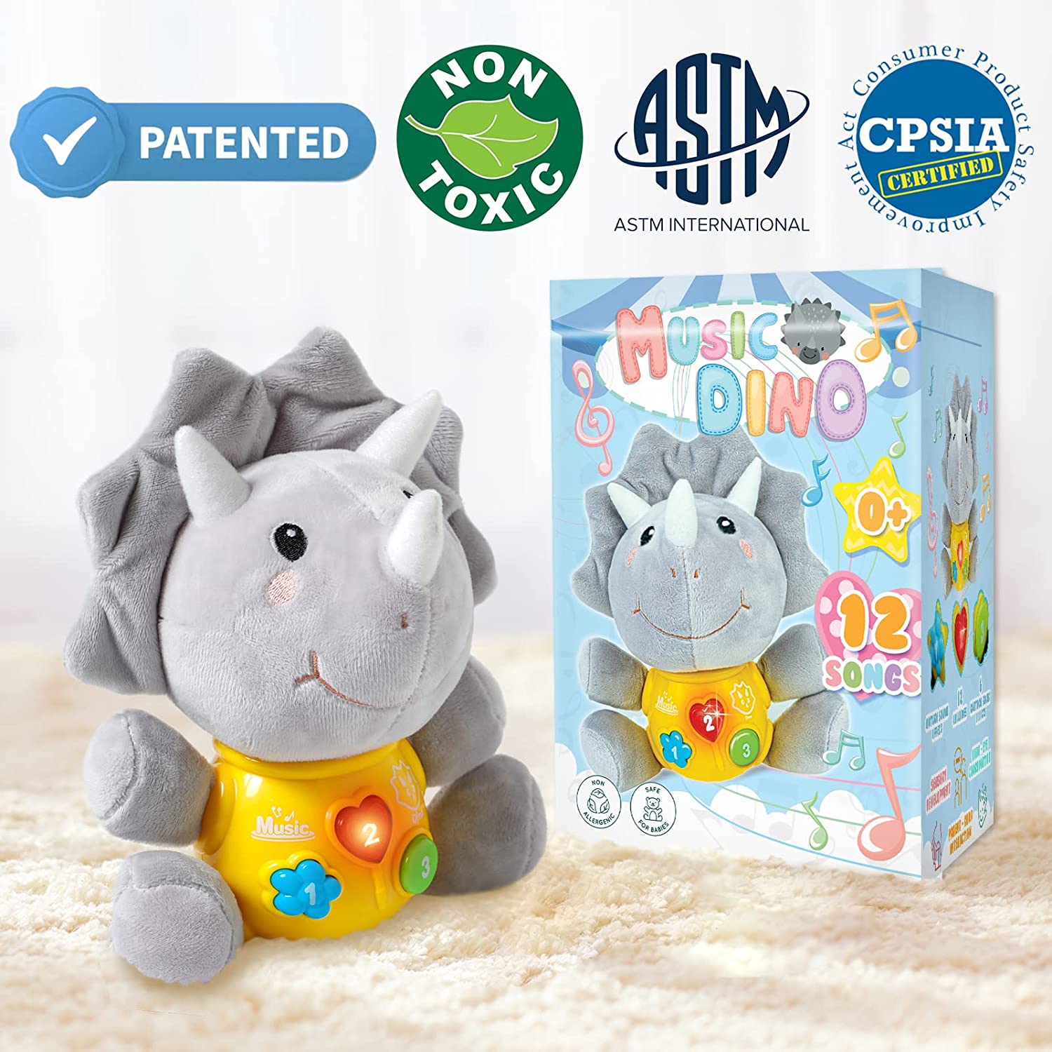 • BABYHOOD & BEYOND - This sensory musical plush toy Dino is battery operated and made for ages 3 months up. 7" compact size is perfect for holding, soothing, and carrying around even to the outdoors.